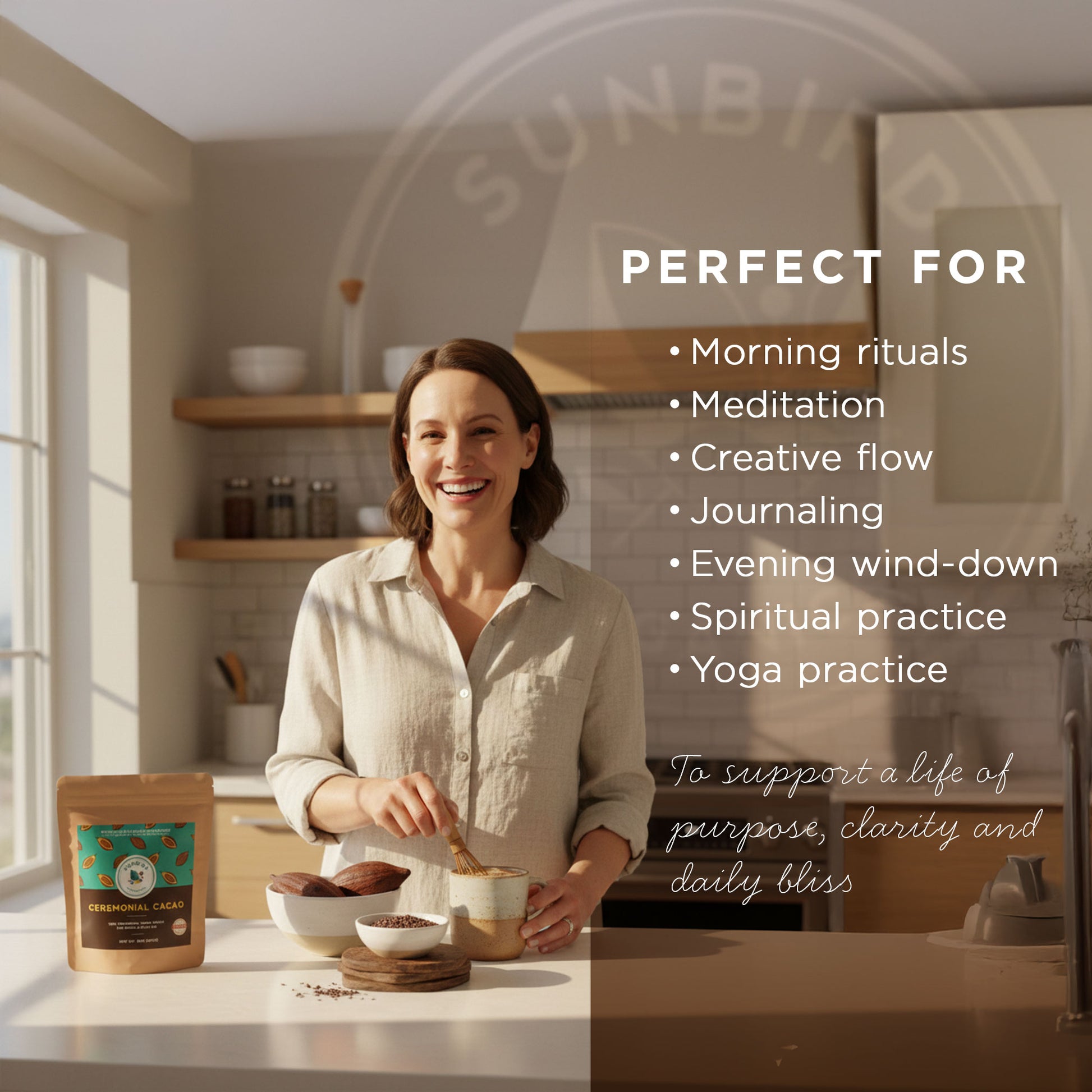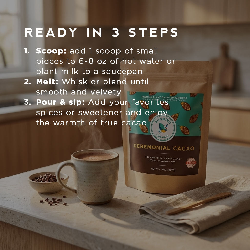 Sunbird Organics Ceremonial Cacao is enjoyed around the world as a coffee alternative, a vegan hot chocolate, or a mindful beverage before yoga, meditation, journaling, or creative work. Whether you sip it in the morning for calm focus or in the evening to unwind, each cup invites you to slow down and savor the moment.