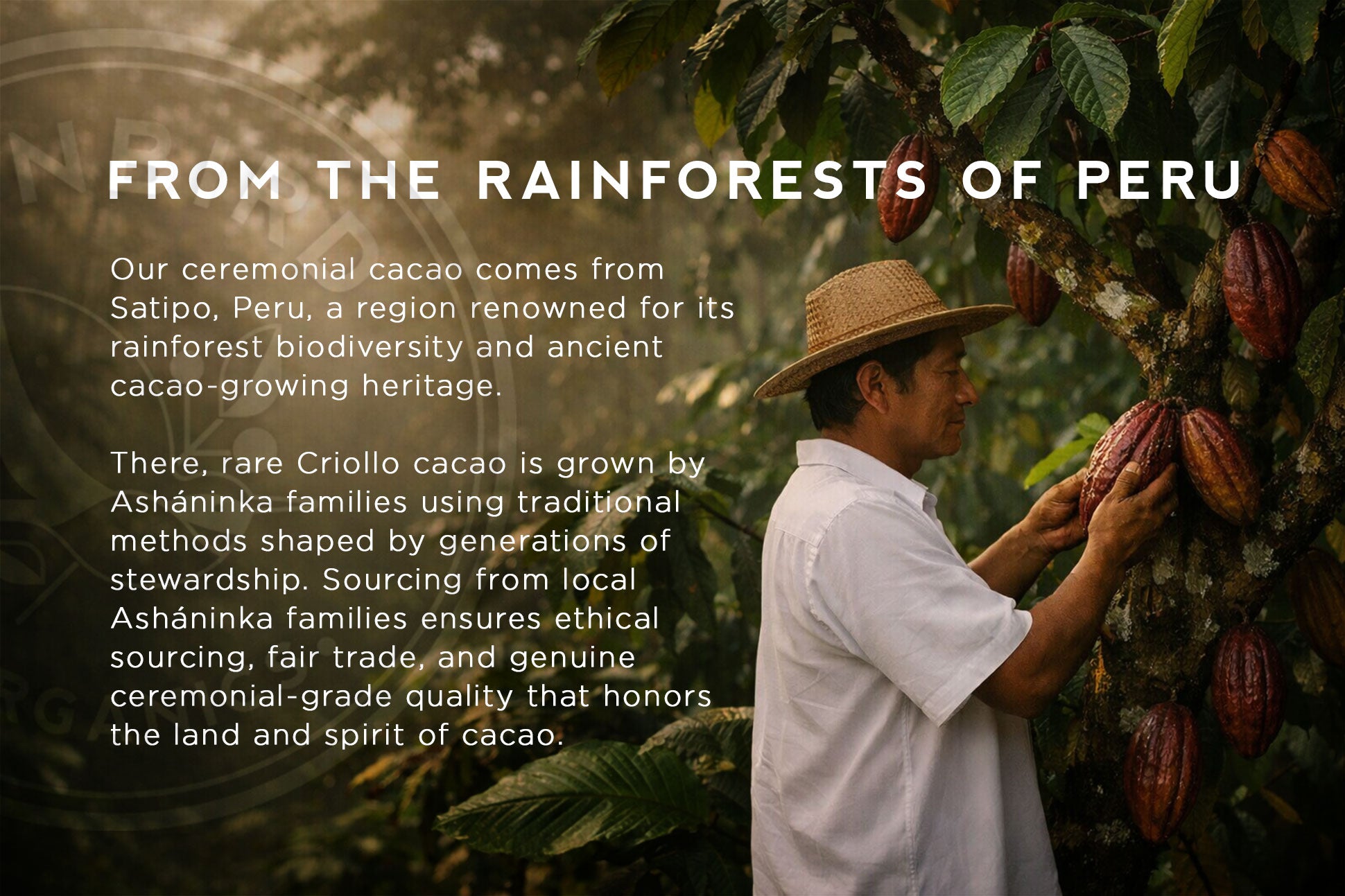 Sunbird Organics Ceremonial Cacao is crafted from rare Criollo cacao beans grown in the rainforests of Satipo, Peru, one of the world’s most biodiverse cacao regions. Sourced directly from Asháninka farming families, this single-origin cacao honors generations of traditional cultivation while delivering exceptional flavor and quality in every cup.