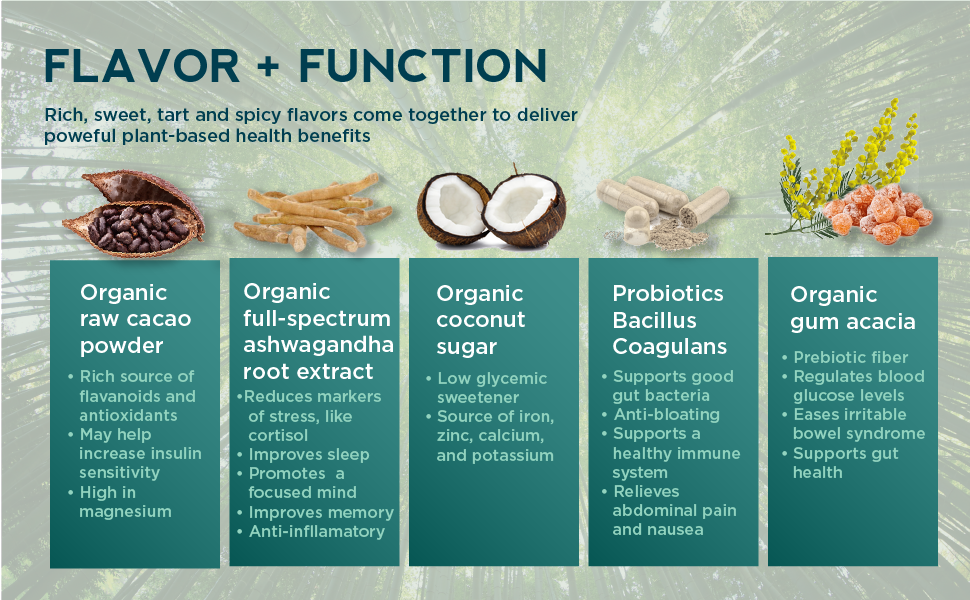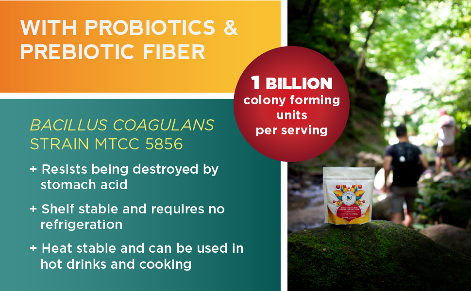 Note: The palm trees used for our coconut sugar are NOT from the ecosystem-damaging palm tree plantations that produce palm oil at the expense of valuable native forests around the tropics. - Prebiotic Fiber and Probiotics (Acacia Fiber and Bacillus coagulans, strain MTCC 5856): Each serving includes 1 billion CFUs of Bacillus coagulans, a probiotic strain that’s heat and shelf-stable. Combined with prebiotic fiber, it supports your body's natural digestive health.